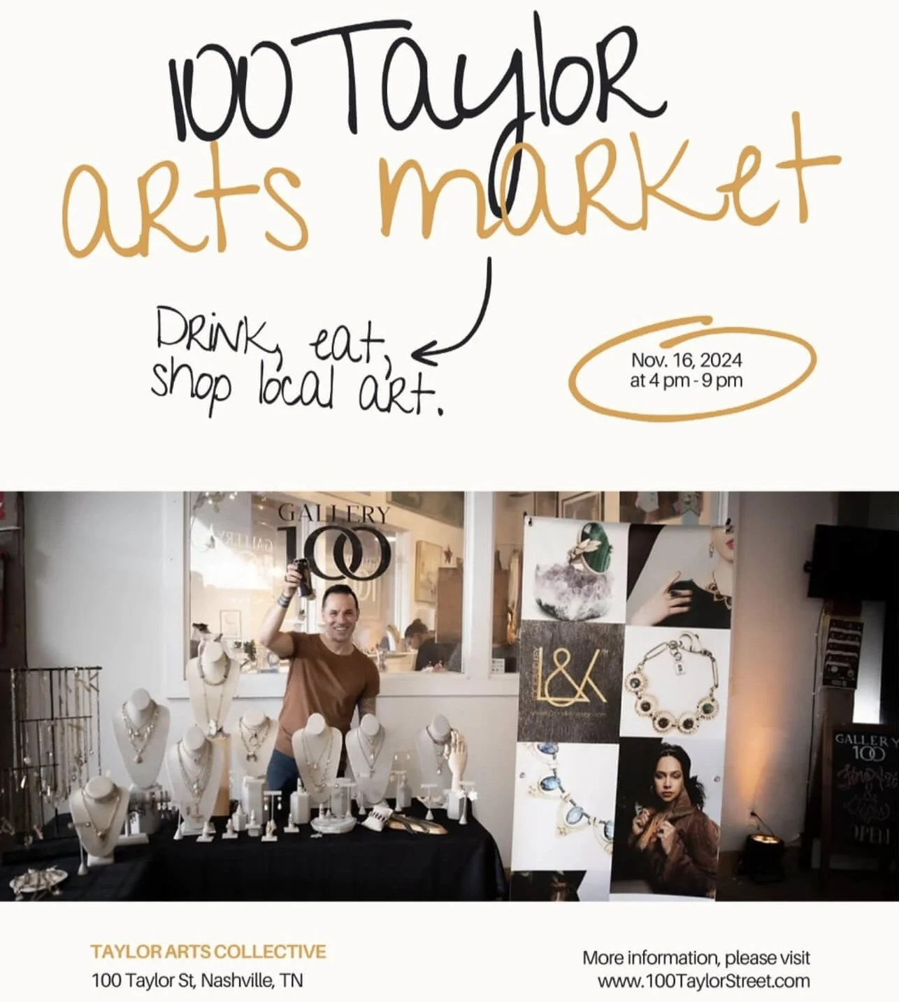 eat ✦ glass @ 100 taylor arts market Saturday, November 16, 2024 4:00 PM 9:00 PM Taylor Arts Collective 100 Taylor Street Nashville, TN, 37208 United States (map) Google Calendar ICS